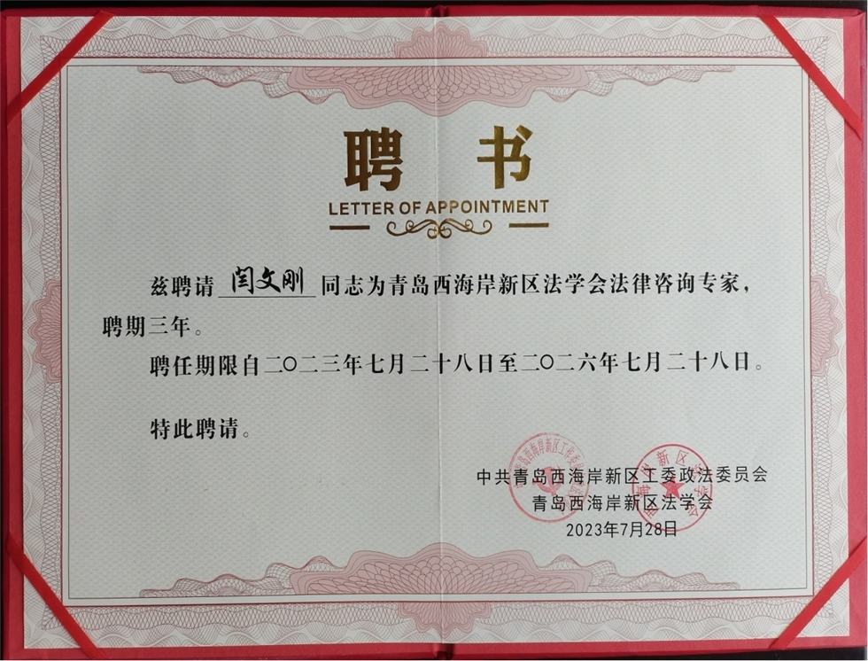 本次首席法律咨询专家推选工作是为深入贯彻落实中央全面依法治国决策部署,积极推进国家治理体系和治理能力现代化,充分发挥法学会在平安西海岸建设中的职能作用,根据中国法学会、山东省法学会、青岛市法学会关于推进首席法律咨询专家制度工作部署要求而在全区范围内开展的。近几年,闫文刚律师深耕政府法律服务,为基层社会治理、社会稳定贡献法律智慧。入选法学会法律咨询专家库,体现了新区法学会对信公律师专业性的肯定。