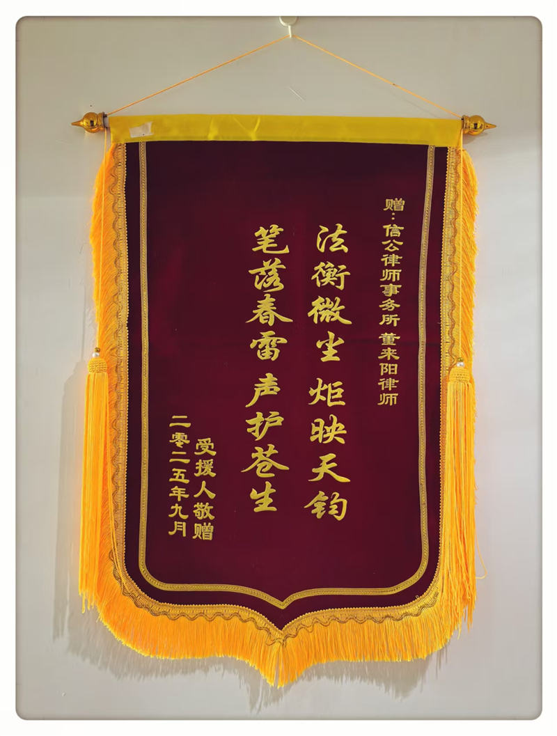 近日,董来阳律师收到快递公司邮寄一面“法衡微尘 炬映天钧 笔落春雷 声护苍生”的锦旗,该锦旗落款为“受援人敬赠”。